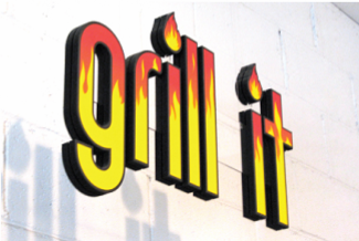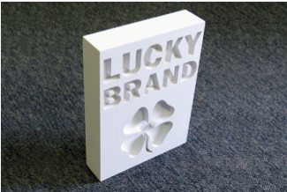 3D lettering + logos can have a variety of facings: printed designs or solid colors, matte or gloss finish, plus various metallic options. Thicknesses range from 1/8″ up to several inches. We can apply double-sided tape or mount to clear or colored acrylic if desired.